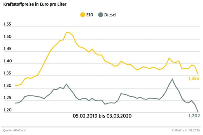 München (ots) Die Spritpreise an den Tankstellen geben weiter nach. Dies ist vor allem eine Folge der eingebrochenen Rohölnotierungen. Laut aktueller Auswertung des ADAC kostet ein Liter Super E10 im Bundesmittel 1,325 Euro, das sind 3,1 Cent weniger als in der Vorwoche. Diesel verbilligte sich um 2,4 Cent auf durchschnittlich 1,178 Euro je Liter. Der…