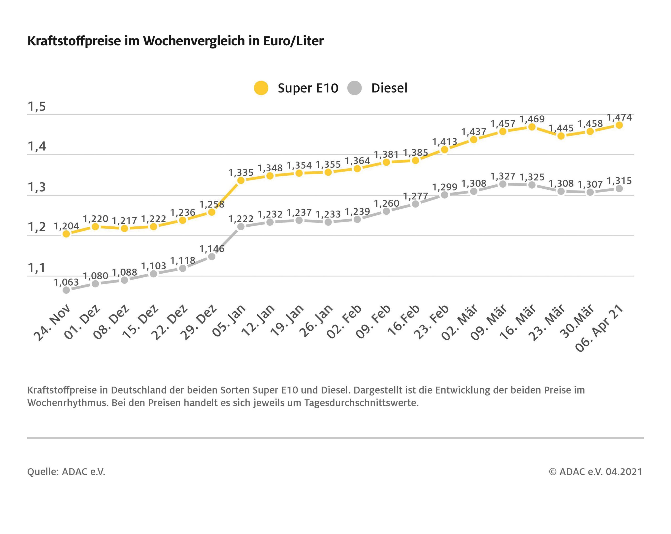 Die Preise an den Zapfsäulen sind erneut gestiegen. Das ermittelt der ADAC in seiner wöchentlichen Kraftstoffpreisauswertung. Demnach kostet ein Liter Super E10 im Bundesschnitt 1,474 Euro. Das sind 1,6 Cent mehr als in der vergangenen Woche.