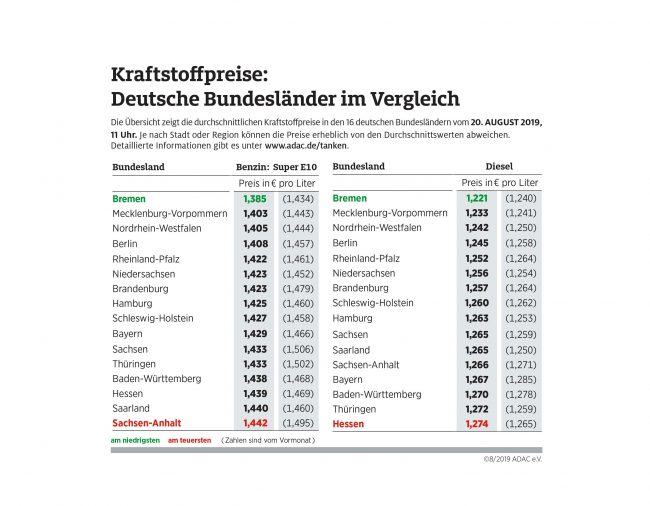 München (ots) Wie bereits im Juli tanken Autofahrer deutschlandweit im Stadtstaat Bremen am günstigsten: Ein Liter Super E10 kostet hier durchschnittlich 1,385 Euro und damit 5,7 Cent weniger als im teuersten Bundesland Sachsen-Anhalt (1,442 Euro). Für einen Liter Diesel müssen Autofahrer in Bremen im Mittel 1,221 Euro und damit 5,3 Cent weniger als in Hessen bezahlen,…