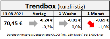 Im Vergleich zu gestern können Verbraucher heute mit einem leichten Abschlag von durchschnittlich 24 Cent rechnen, während der Preis am vergangenen Freitag quasi der gleiche war. Am günstigsten war Heizöl am Wochenanfang gewesen. Trotz des auf die Woche betrachteten Preisanstiegs weist die kurzfristige Trendbox für den Monatsvergleich einen roten Pfeil auf und zeigt einen Preisrückgang von etwa einem Prozent. Seit Anfang August sind die Preise um etwa 2,2 Prozent gefallen.