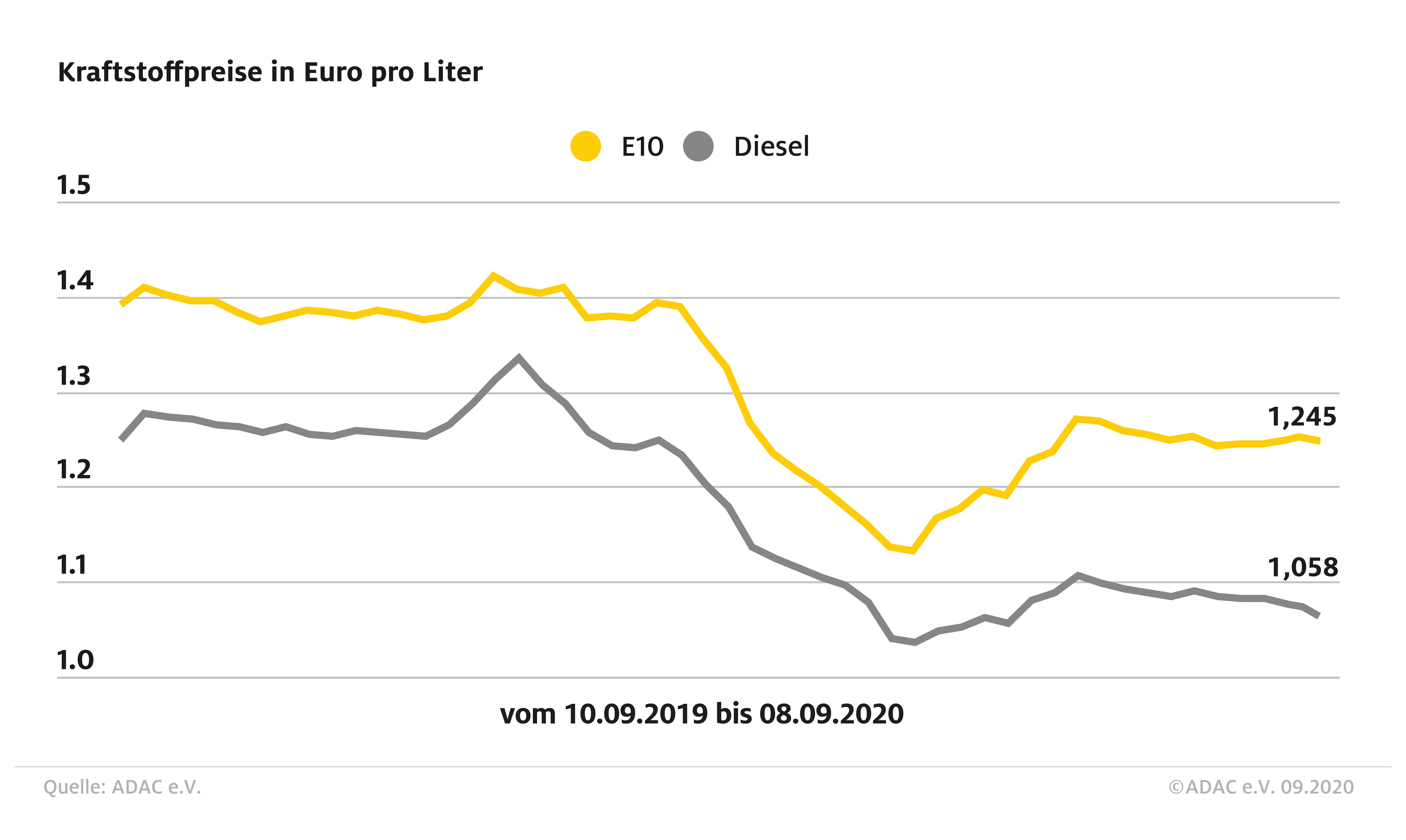 München (ots) – Die Kraftstoffpreise sind im Wochenvergleich zurückgegangen. Für Super E10 verzeichnet der ADAC einen Rückgang von 0,9 Cent. Ein Liter kostet im Bundesschnitt 1,245 Euro. Beim Diesel ist ein noch stärkerer Preisrückgang zu verzeichnen. Hier sinkt der Preis für einen Liter um 1,4 Cent auf 1,058 Euro.