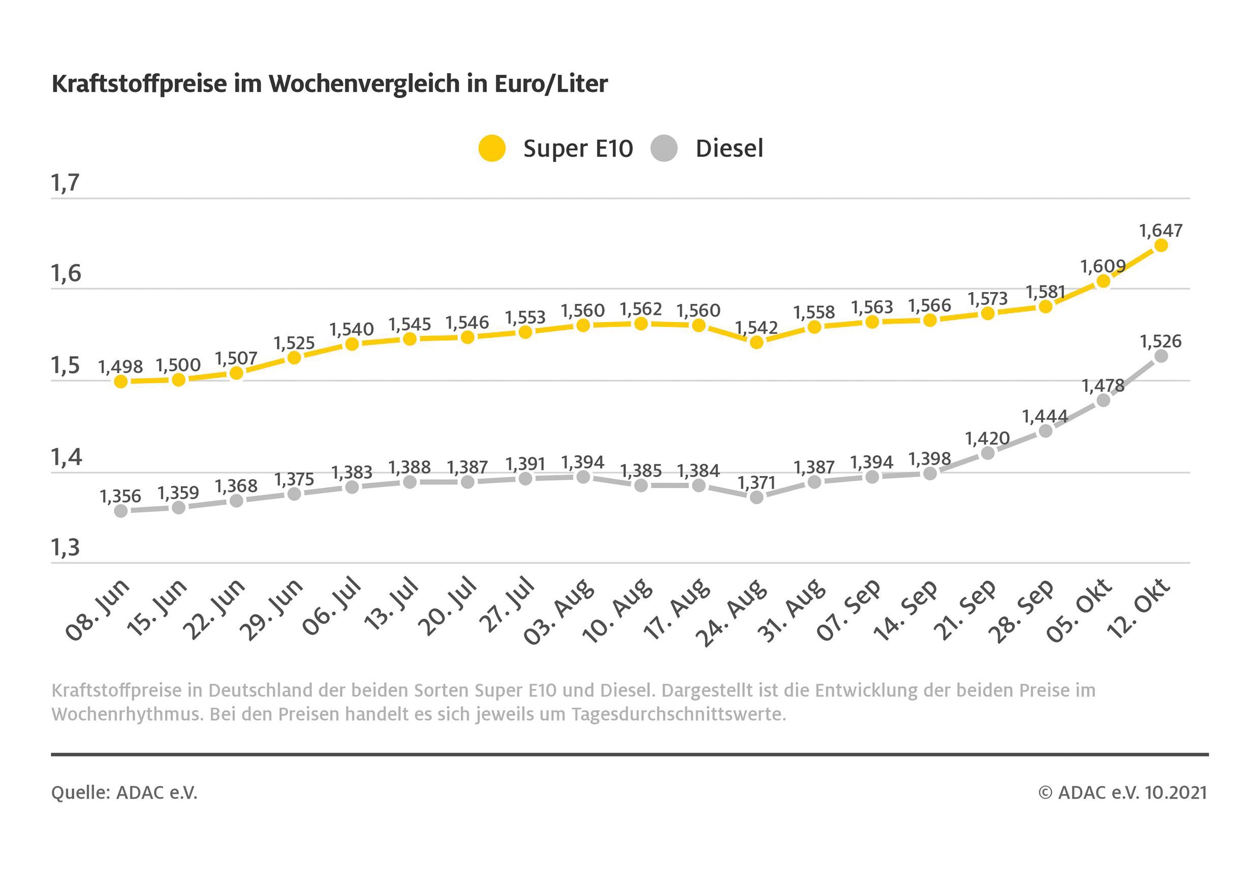 Damit sind die Kraftstoffpreise so hoch wie lange nicht. Zum Vergleich: Das Allzeithoch bei Super E10 wurde am 13. September 2012 erreicht. Damals kostete ein Liter 1,709 Euro. Beim Diesel war dies mit 1,554 Euro pro Liter am 26. August 2012 der Fall.
