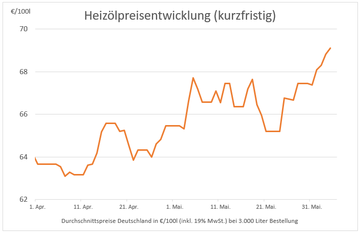 Markant ist jedoch die Preissteigerung im Jahresvergleich. Während die Heizölpreise seit 17 Monaten unter dem Niveau von 2019 (vor dem coronabedingten Preiseinbruch) gelegen hatten, sind sie heute erstmals höher als am gleichen Tag in 2019. Im Vergleich zum 4. Juni 2019 kostet Heizöl den Verbraucher heute etwa 6,6 Prozent oder 4,28 Euro mehr.